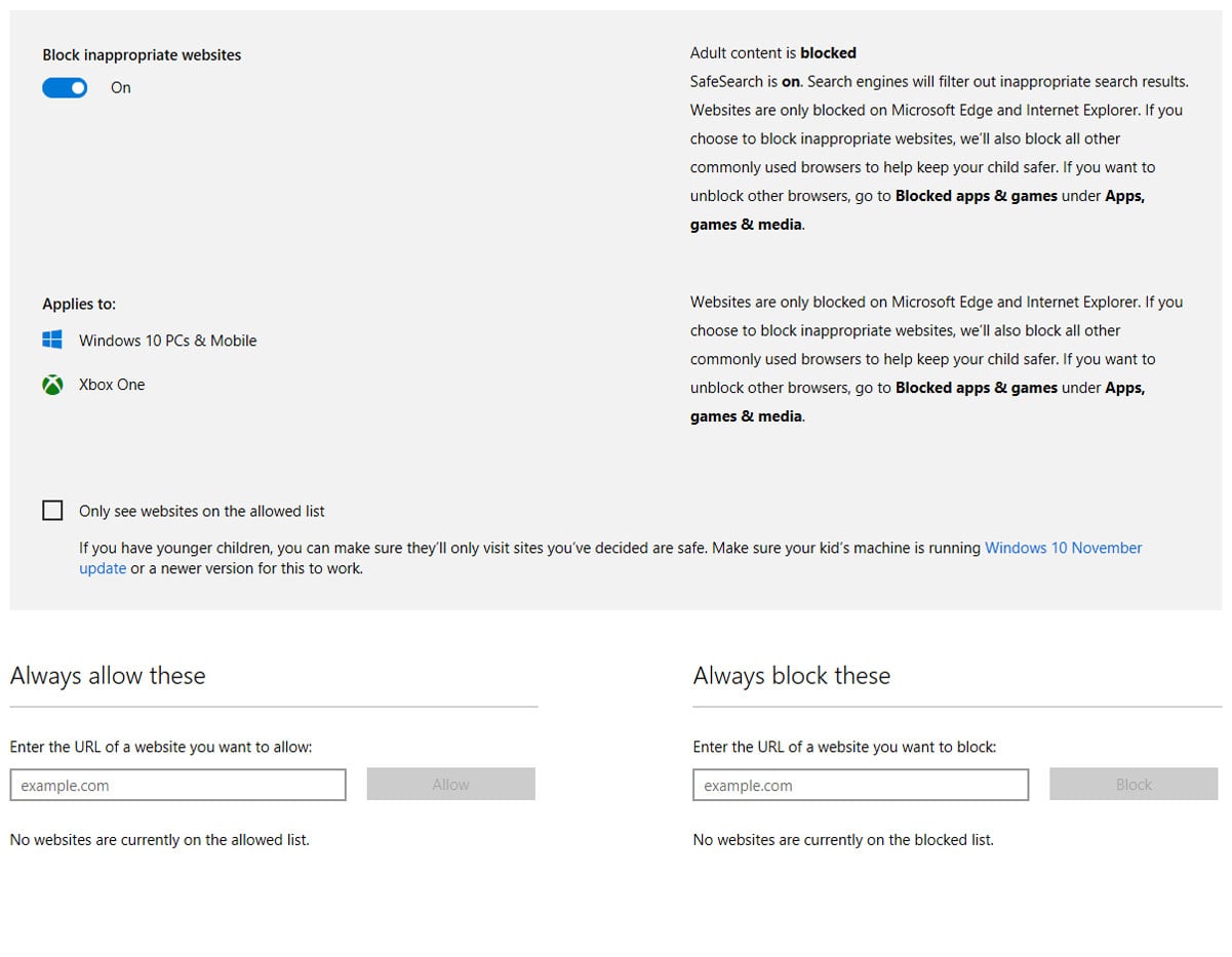 Windows will block search results and filter websites known to contain inappropriate content. However, there are a few weaknesses to web filter-based approaches, like the one Microsoft uses here to screen mature content. A website that hasn’t been added to the ‘adult content’ blacklist will be accessible, as will user-generated content (such as comments or social media posts) on otherwise ‘safe’ sites.