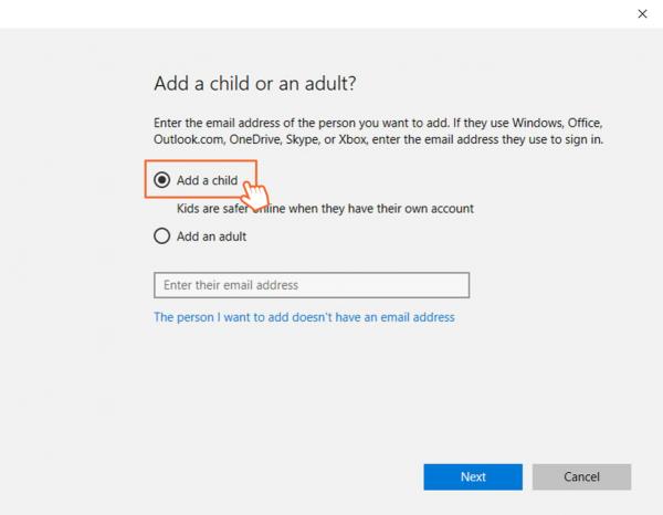 5. “Add a Child” is selected by default. If not, click “The person I want to add doesn’t have an email address” and we’ll walk you through creating one for them.