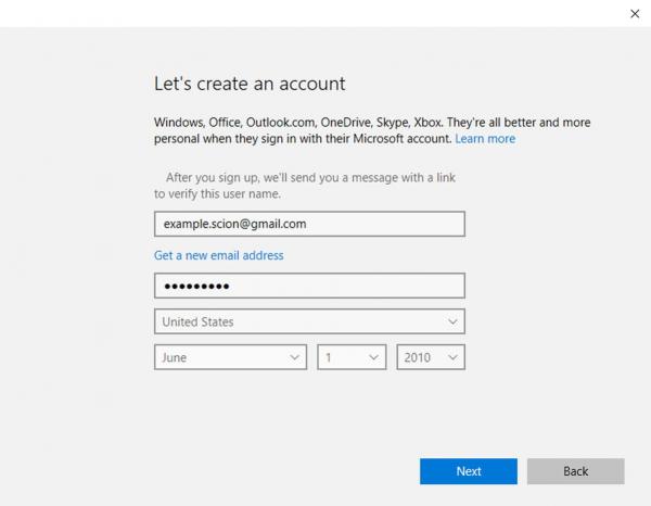7. If you need to create a Microsoft Account, fill in your child’s email address (or one you create for this purpose) and details here. remember the password created.