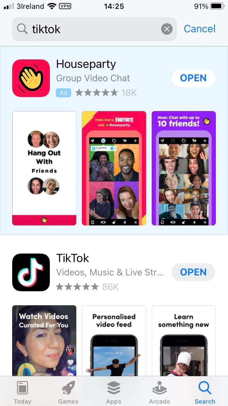 Looking for TikTok but offered Houseparty top of the list, Apple and TikTok are having a lovers tiff. Once that row is sorted TikTok will take is place again at the top of the list. Houseparty has also grown since Covid19
